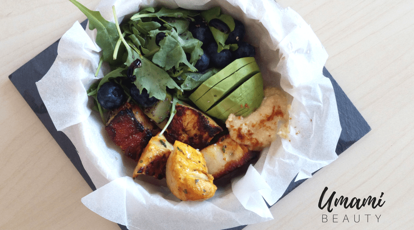 Buddha Bowl de humus de garbanzos, pollo, rúcula, canónigos, aguacate, arandanos, y chia