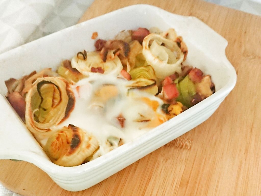 Los ingredientes son: un puerro, un poquito de queso de cabra, dos huevos y taquitos de jamón.