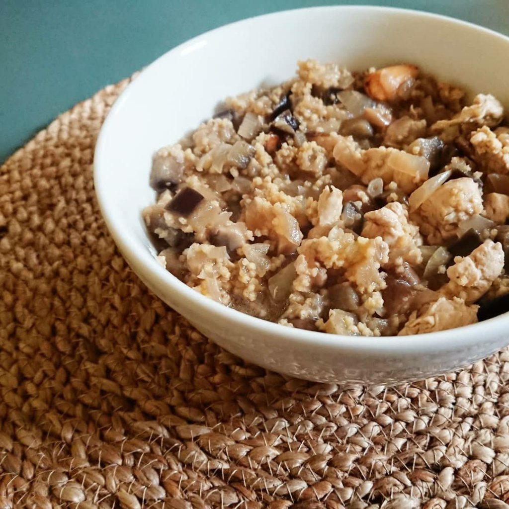 Ingredientes para una persona: 1/2 pechuga de Pollo, 1/2 cebolla mediana, 1/2 berenjena grande (o dos si son de las súper minis), 2 champiñones de los grandes o 4 de los pequeños, una cucharada de almendras, un poquito de mijo (dos cucharadas soperas) un pelín de vino blanco.